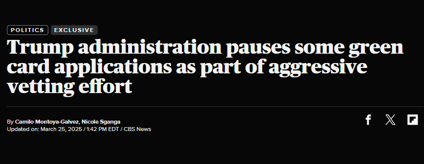 当地时间3月25日,美国表示暂停处理部分“绿卡”的申请,以进行额外的筛选和审查。